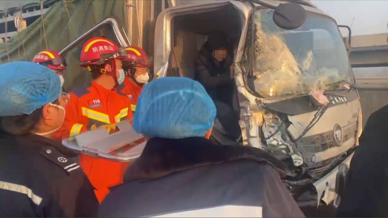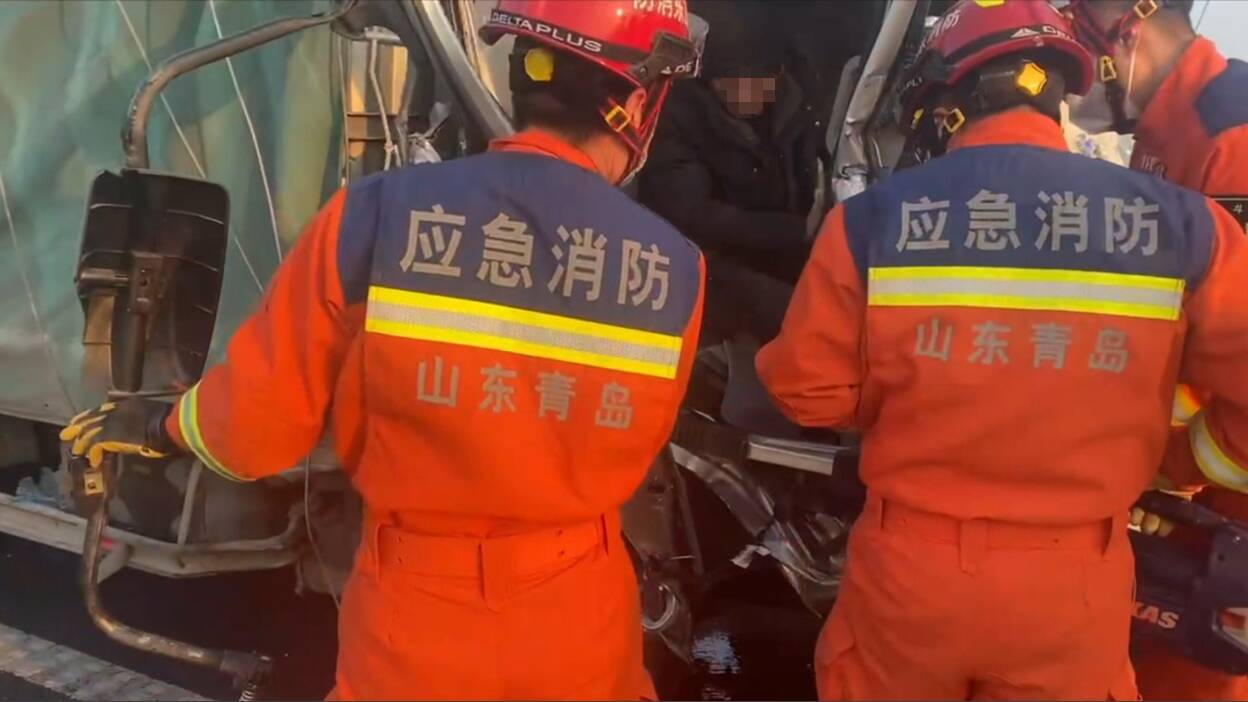12月27日上午7时许,青岛市即墨区高速路段发生一起车祸,一辆货车撞上护栏,有一名男子被困车内,急需救援。消防救援人员立即赶赴现场救援,到场后,经勘查发现,货车驾驶室右侧撞毁严重,向内凹陷;副驾驶室一名男子腿部被紧紧卡住,不能动弹。