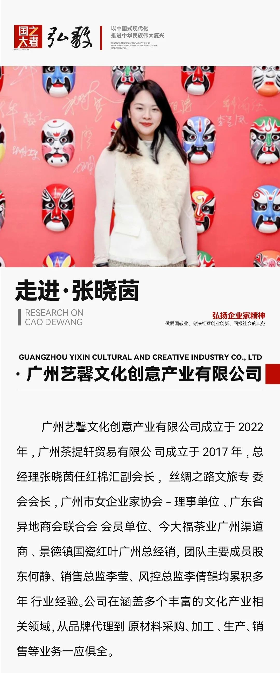 2022年张晓茵在继续发展茶行业的同时,到景德镇考察并代理中国现今唯一的国营陶瓷厂家,景德镇国瓷红叶品牌,为其广州总经销, 成立广州艺馨文化创意产业有限公司。