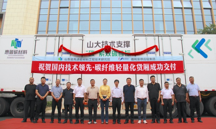 6月28日,在山东省济宁国家高新技术产业开发区内的山东省先进碳材料工程技术研究院中试基地里举行了国内首辆碳纤维轻量化货厢交付仪式和物流领域载具轻量化技术应用推广座谈会。来自山东省碳纤维工程技术研究中心、山东省先进碳材料工程技术研究院、济宁市科技局、济宁市国有资产投资控股有限公司、济宁高新区科技创新局、济宁高新区新材料产业园管委会,以及企业代表山东雅利安供应链管理集团有限公司、山东云水网运物流公司、山东梁山泊龙汽车科技有限公司、聚仕恒成新材料(山东)有限公司、卡福新材料科技(山东)有限公司等产业链上下游企业和新闻媒体共同参加了本次活动。