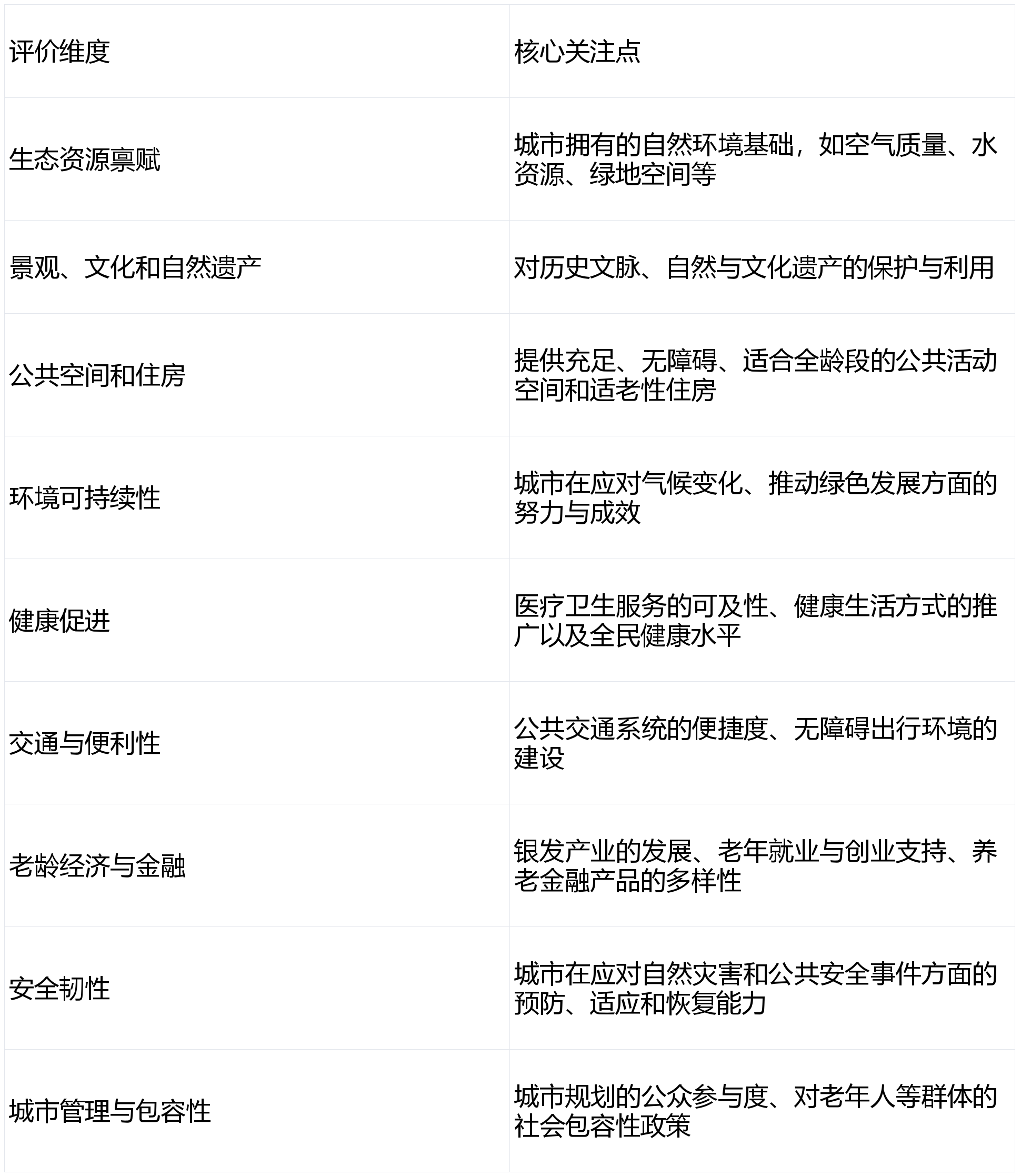 联合国“世界康养城市”的标准是一套全面的评价体系,目的是指导全球城市科学地建设健康与老年友好的宜居环境。表1是其核心框架和关键维度。